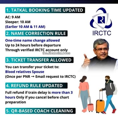 ЁЯЪЖ IRCTC New Train Rules 2025 тАУ рд╣рд░ рдпрд╛рддреНрд░реА рдХреЛ рдЬрд╛рдирдирд╛ рдЬрд╝рд░реВрд░реА рдЕрдЧрд░ рдЖрдк рдЯреНрд░реЗрди рд╕реЗ рд╕рдлрд░ рдХрд░рддреЗ рд╣реИрдВ рдФрд░ IRCTC рдХреЗ рдирдП рдирд┐рдпрдо рдирд╣реАрдВ рдЬрд╛рдирддреЗ, рддреЛ рдЖрдкрдХрд╛ Tatkal рдЯрд┐рдХрдЯ miss, refund reject рдпрд╛ ticket cancel рднреА рд╣реЛ рд╕рдХрддрд╛ рд╣реИред 2025 рдореЗрдВ Indian Railways рдиреЗ рдпрд╛рддреНрд░рд┐рдпреЛрдВ рдХреЗ рд▓рд┐рдП 5 рдмрдбрд╝реЗ рдмрджрд▓рд╛рд╡ рдХрд┐рдП рд╣реИрдВред ЁЯФ┤ 1. Tatkal Booking Time Updated рдЕрдм Tatkal рдЯрд┐рдХрдЯ рдХрд╛ рд╕рдордп рдмрджрд▓ рдЧрдпрд╛ рд╣реИ: тЬЕ AC Tatkal тАУ рд╕реБрдмрд╣ 9:00 рдмрдЬреЗ тЬЕ Sleeper Tatkal тАУ рд╕реБрдмрд╣ 10:00 рдмрдЬреЗ рдкрд╣рд▓реЗ AC 10 рдмрдЬреЗ рдФрд░ Sleeper 11 рдмрдЬреЗ рд╣реЛрддрд╛ рдерд╛ред рдЧрд▓рдд рд╕рдордп рдкрд░ login рдХрд░рдиреЗ рд╕реЗ рдЯрд┐рдХрдЯ рд╣рд╛рде рд╕реЗ рдирд┐рдХрд▓ рд╕рдХрддрд╛ рд╣реИред ЁЯФ┤ 2. Name Correction Rule (рдПрдХ рдмрд╛рд░ рдореМрдХрд╛) рдЕрдм IRCTC рдкрд░: тЬФя╕П рдЯрд┐рдХрдЯ рдореЗрдВ рдирд╛рдо рдПрдХ рдмрд╛рд░ рдмрджрд▓рд╛ рдЬрд╛ рд╕рдХрддрд╛ рд╣реИ тЬФя╕П рдпрд╛рддреНрд░рд╛ рд╕реЗ 24 рдШрдВрдЯреЗ рдкрд╣рд▓реЗ рддрдХ тЬФя╕П рдХреЗрд╡рд▓ verified IRCTC account рд╕реЗ рдпрд╣ rule spelling mistake рдпрд╛ surname change рд╡рд╛рд▓реЛрдВ рдХреЗ рд▓рд┐рдП рдмрд╣реБрдд рдлрд╛рдпрджреЗрдордВрдж рд╣реИред ЁЯФ┤ 3. Ticket Transfer Allowed рдЕрдм рдЖрдк рдЕрдкрдирд╛ рдЯрд┐рдХрдЯ рдЯреНрд░рд╛рдВрд╕рдлрд░ рдХрд░ рд╕рдХрддреЗ рд╣реИрдВ: ЁЯСитАНЁЯСйтАНЁЯСж Blood relatives тЭдя╕П Spouse (рдкрддрд┐ / рдкрддреНрдиреА) ЁЯУМ рдирд┐рдпрдо: рдПрдХ PNR рдкрд░ рд╕рд┐рд░реНрдл рдПрдХ рдмрд╛рд░ IRCTC рдХреЛ email request рднреЗрдЬрдиреА рд╣реЛрдЧреА ЁЯФ┤ 4. Refund Rule Updated рдЕрдЧрд░ рдЖрдкрдХреА рдЯреНрд░реЗрди: тП░ 3 рдШрдВрдЯреЗ рд╕реЗ рдЬреНрдпрд╛рджрд╛ рд▓реЗрдЯ рд╣реЛ тЭМ рдФрд░ рдЖрдкрдиреЗ chart рдмрдирдиреЗ рд╕реЗ рдкрд╣рд▓реЗ cancel рдХрд┐рдпрд╛ рддреЛ рдЖрдкрдХреЛ: ЁЯСЙ рдкреВрд░рд╛ refund рдорд┐рд▓реЗрдЧрд╛ Chart рдХреЗ рдмрд╛рдж cancel рдХрд░рдиреЗ рдкрд░ refund рдирд╣реАрдВ рдорд┐рд▓реЗрдЧрд╛ред ЁЯФ┤ 5. QR Based Coach Cleaning (New Feature) рдЕрдм рд╣рд░ рдЯреНрд░реЗрди coach рдореЗрдВ: ЁЯУ▒ QR Code Scan рдХрд░рддреЗ рд╣реА cleaning request ЁЯз╣ Cleaning staff 10 рдорд┐рдирдЯ рдореЗрдВ coach рдкрд╣реБрдВрдЪреЗрдЧрд╛ ЁЯУН IRCTC app рдореЗрдВ tracking рднреА available рд╣реИ тЭУ FAQs (Google Rank Booster) Q. Tatkal ticket ka new time kya hai? ЁЯСЙ AC тАУ 9 AM, Sleeper тАУ 10 AM Q. Kya train ticket kisi aur ko transfer ho sakta hai? ЁЯСЙ Haan, blood relative ya spouse ko Q. Train late hone par refund milega? ЁЯСЙ 3 рдШрдВрдЯреЗ рд╕реЗ рдЬреНрдпрд╛рджрд╛ delay + chart рд╕реЗ рдкрд╣рд▓реЗ cancel = full refund тЬЕ Conclusion IRCTC рдХреЗ рдпреЗ рдирдП рдирд┐рдпрдо рд╣рд░ рдЯреНрд░реЗрди рдпрд╛рддреНрд░реА рдХреЛ рдЬрд╛рдирдиреЗ рдЪрд╛рд╣рд┐рдПред рдПрдХ рдЫреЛрдЯреА рд╕реА рдЬрд╛рдирдХрд╛рд░реА рдЖрдкрдХреЛ рдкреИрд╕реЗ рдФрд░ рдкрд░реЗрд╢рд╛рдиреА рджреЛрдиреЛрдВ рд╕реЗ рдмрдЪрд╛ рд╕рдХрддреА рд╣реИред IRCTC New Train Rules 2025: Tatkal Time, Ticket Transfer, Name Change & Refund Rules Explained IRCTC new rules 2025 Tatkal booking time Train ticket transfer rules IRCTC refund rules Indian railway news Train travel rules India